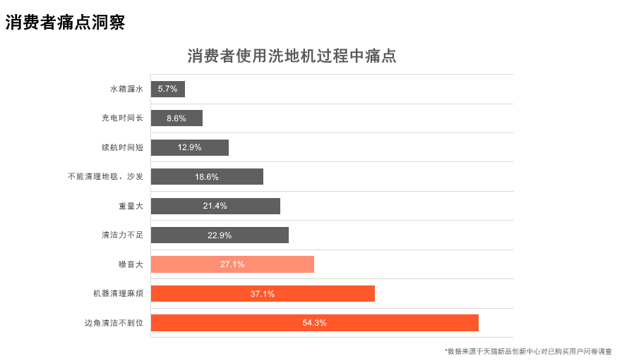 消费者在使用洗地机的过程中,主要遇到的问题是边角的清洁、机器是否需要二次清洁、使用噪音等问题。