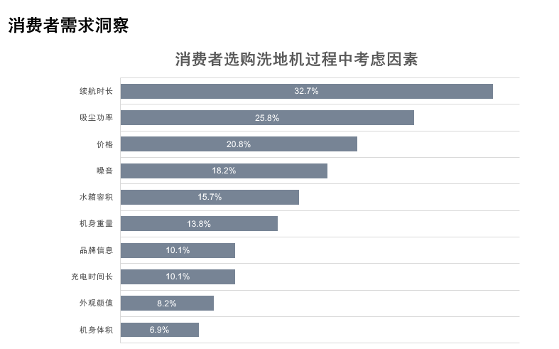 消费者在选购洗地机过程中,主要考虑的问题有以下几点,首先是续航、其次是功率大小、价格、噪音、水箱体积等